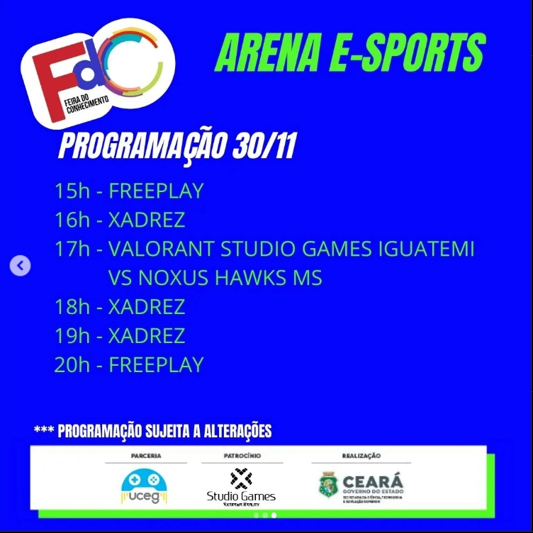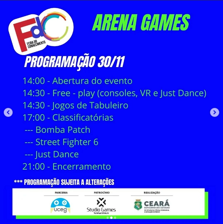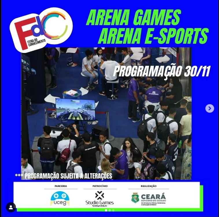 novembro 30, 2023A seguir segue a nossa programação da Arena MetaGames e E-Sports que estamos comandando na Feira do Conhecimento do Ceará que ocorre do dia 30/11/2023 até o dia 02/12/2023.